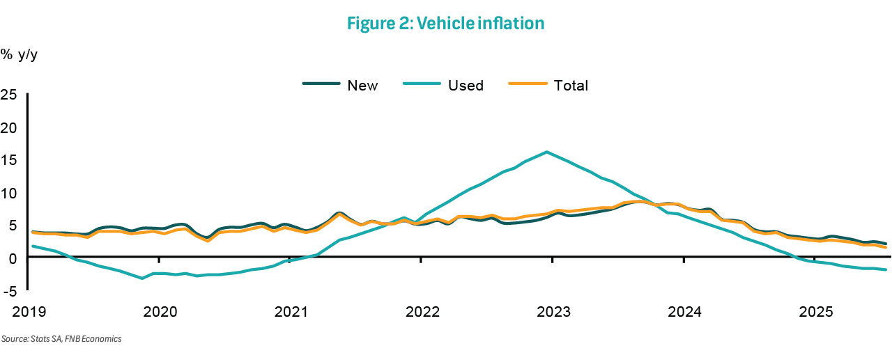 Of more interest is what could be developing in the core goods space. While alcoholic beverages and tobacco inflation would have been affected by effective sin tax increases that were announced later in the year, we are paying attention to how trade patterns may affect imported inflation. We have already witnessed the influx of Asian vehicle brands in SA and believe the impact is starting to show up in the transport inflation figures. Vehicle price inflation has continued a downward trend this year, settling at 1.5% in July, after a brief recovery between 2022 and 2023 where inflation breached 8% and below the near 5% five-year average before the pandemic year.