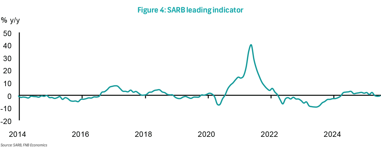 The leading business cycle indicator rose by 0.4% m/m in June to 111.7 points, following a 1.3% decline in May. The improvement was driven by gains in three of the seven available components, with the largest contributions coming from an acceleration in the six-month smoothed growth rate of real M1 money supply and an increase in South Africa's US dollar-denominated export commodity price index. However, despite the monthly uptick, the indicator declined on an annual basis for the third consecutive month, highlighting a subdued growth environment in line with our 1.0% GDP growth forecast for 2025.