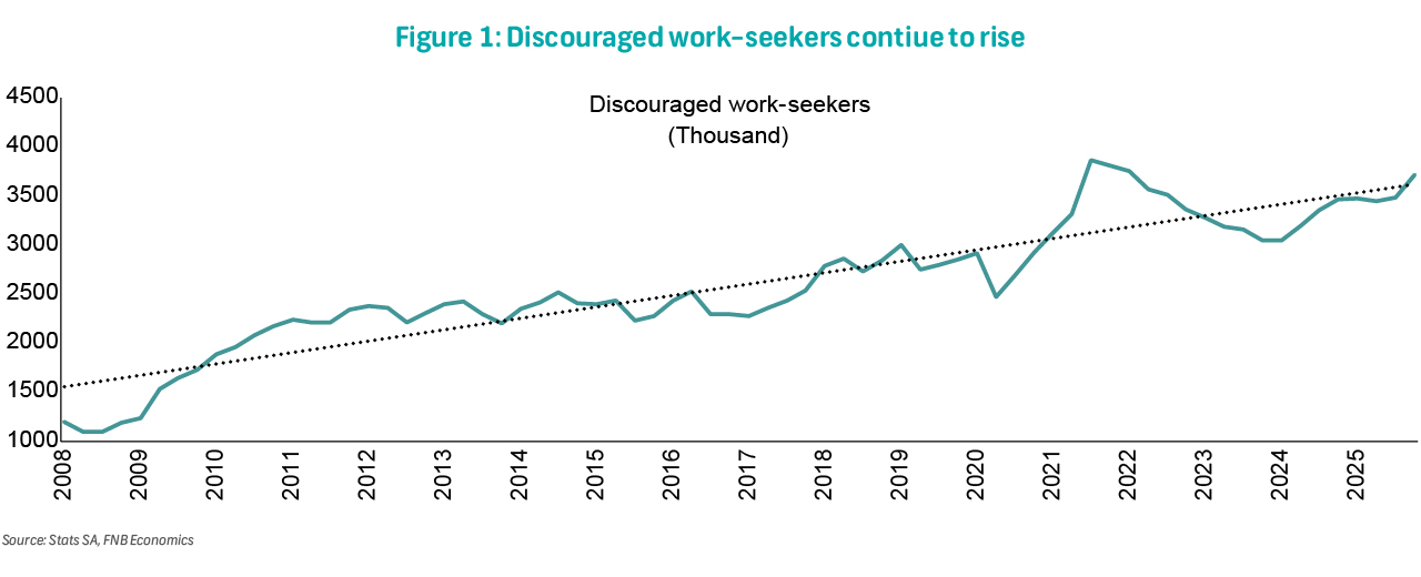 At 40.6%, the labour absorption rate remains well below the 46.2% peak recorded in 2008 (Figure 2), highlighting persistent structural weakness in South Africa's labour market.