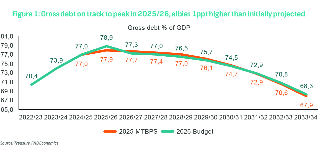 Titled, 'A fiscal turning point in a resilient economy', the 2026 Budget tabled by Minister of Finance Enoch Godongwana, reflects that the fiscal commitment made three years ago to stabilise debt in the current fiscal year (2025/26) is on track, with debt now estimated to peak at 78.9% of GDP and projected to gradually decline over the medium term to 76.5% in 2028/29, reaching 68.3% by 2033/34 (Figure 1). While the estimated peak point is higher by 1.0-percentage points (ppts) relative to the 2025 MTBPS target of 77.9%, it partly reflects lower nominal GDP than previously projected, as well as government's decision to increase cash holdings in the current fiscal year to better manage large redemptions due over the medium term.