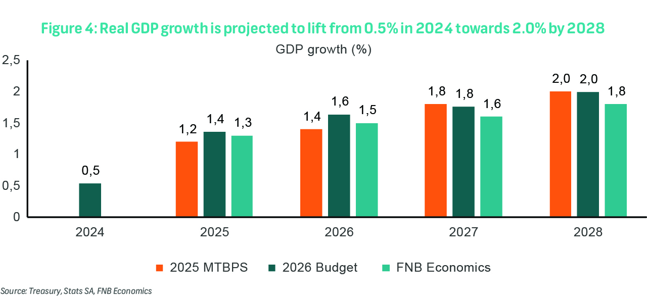 Treasury expects the economy to grow steadily, supported by structural reforms, improved investor confidence, lower interest rates and higher investment. Real GDP growth is estimated to have reached 1.4% in 2025 and is projected to rise to 1.6% in 2026, 1.8% in 2027 and 2.0% in 2028 (Figure 4). Compared to the 2025 MTBPS, this reflects a marginal 0.2ppt lift in the 2025 growth forecast and a 0.1ppt lift in the 2026 growth forecast, while the 2027 and 2028 growth forecasts are unchanged.