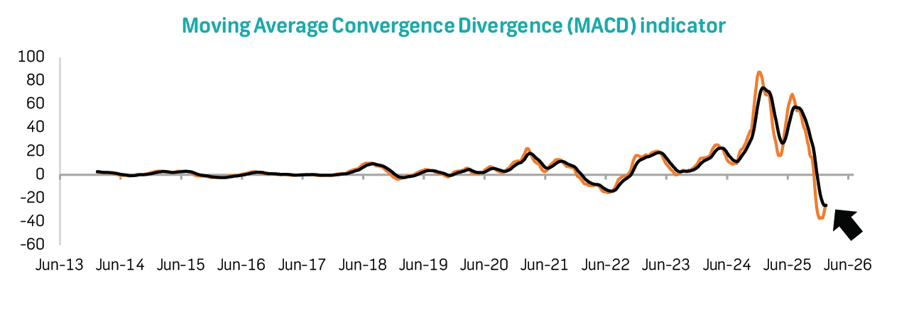 • The lower panel shows the occurrence of the MACD indicator. A bullish crossover, where the MACD line crosses above its signal line, highlights a shift in momentum from negative to positive. This signals that buying pressure is beginning to outweigh selling pressure and offers confirmation of a potential trend reversal or the early stages of a new upward move.