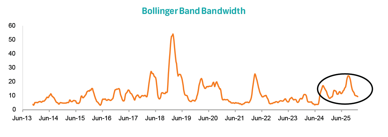 • The rise in Bollinger Band Bandwidth shows volatility expanding after a period of tight consolidation, suggesting that the share is preparing for a directional move. Since this expansion is happening within an uptrend and above key support, the next impulse likely favours the upside. This strengthens the bullish view by indicating that the share may be transitioning from consolidation into a renewed upward phase.